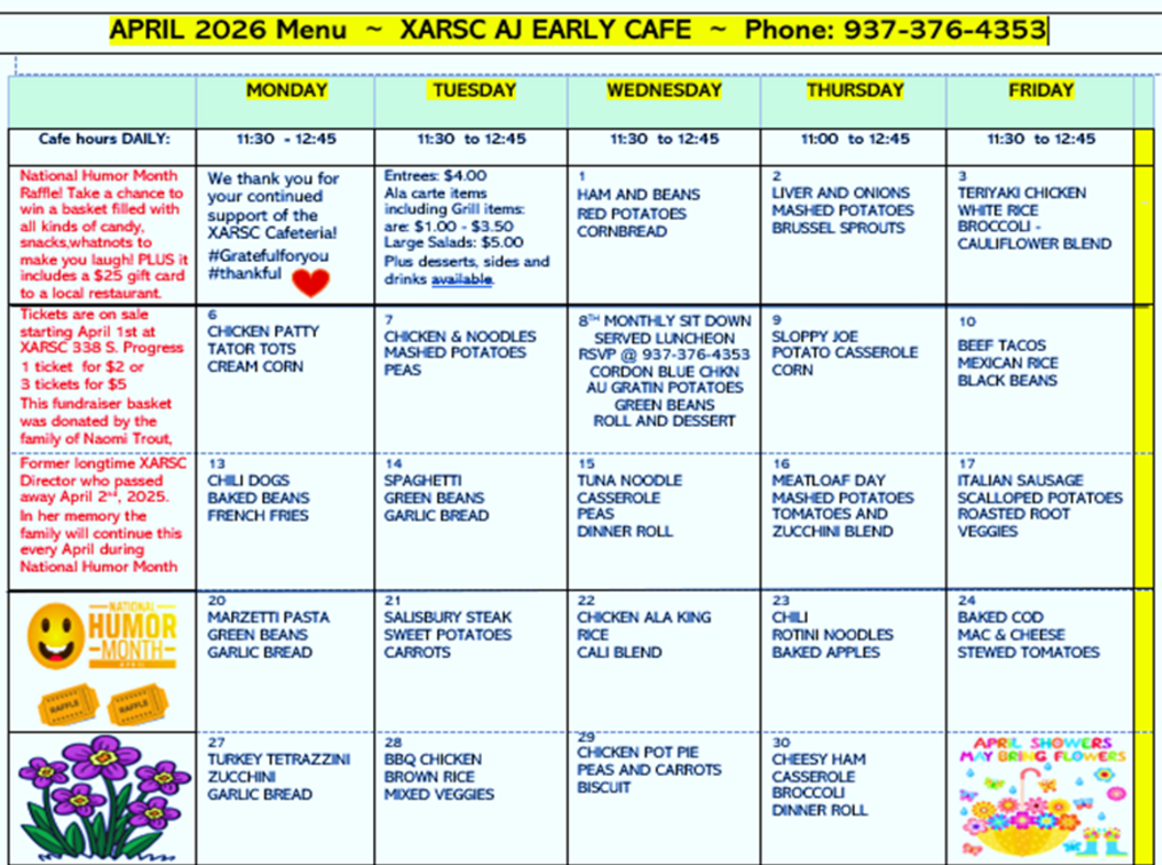 Please remember: The2nd Wednesday of each month is the Sit Down Served Monthly Luncheon for $5. (The walk thru Cafe is closed this day) Only the listed menu on the 2nd Wednesday is available.